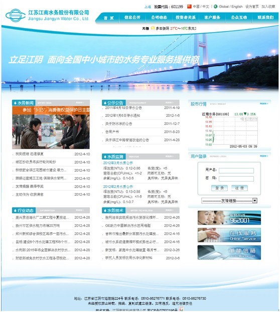 在欄目設置和內容上,進行了重新組合,新網站保留了原網站的信息公開、公司動態和客戶服務模塊;行業動態和水務技術繼續沿用水網的接口,使網站具有最新的水務資訊。首頁新增了股市行情模塊,實時的展現公司股票(證券代碼:601199)的最新行情;新增了“投資者關系”欄目,及時準確地為投資者提供投資信息。同時針對客戶日益增長的網上服務需求,新網站更新了水費查詢系統,該系統與公司營銷系統對接,準確實時地為客戶提供用水清單和用水趨勢圖。并與公司的服務熱線962001實現無縫對接,及時處理客戶的投訴、咨詢與報漏報修等。網站還開設了公眾互動功能,讓客戶更好地了解水、了解水公司。