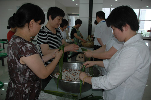 包粽子可是門技術活,別看他人三下兩下就包好一個,沒什么難度,真到自己動手才發(fā)現,單單把米包進粽葉不散就不容易,更別說包得有棱有角了。為了讓大家快速學會包粽子,公司請來幾位老阿姨言傳身教,你看,女員工圍在桌邊,仔細地向老阿姨學習討教呢。
