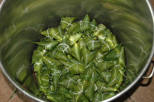挑選3-4張?zhí)J葦葉交錯疊開,將葉子圍成圓錐狀,放進大米花生,包蓋圓錐口,用手攥出棱角,再拿一張粽葉包裹住露出的口子,用繩子扎緊,一個粽子就完成了。看了幾次基本掌握步驟,大家也躍躍欲試,可實踐往往沒有想象的那么簡單,米裝得太松裹不緊,米裝得太多或者壓得太緊又容易把粽葉弄破,好不容易把粽葉包好了,最后封口又是一道難關,捆綁時手稍微一松粽子就散開了。“如果今年再學不會又要等下次活動啦,這次一定要成功!”有些員工已不是第一次參加,或許她們包的并不好,但她們那股認真、執(zhí)著的勁頭值得贊揚。隨著大家的“埋頭苦干”,粽葉漸漸減少,桶里滿滿地堆起大家的“心意”。