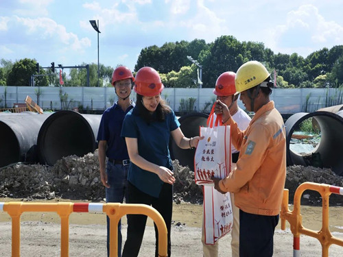 7月21日,市人社局副局長、總工會副主席施曄新一行,冒著酷暑來到錫澄S1線配套給水管道工程施工現場,慰問高溫下堅守崗位的一線職工,送上一份清涼,道一聲辛苦。